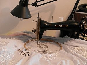 Fehér gépi hímzőt és lánchíd cérnát (alsó szálnak.)Szükséges még a "vezetőszál",általában Honleány fonal.Én mást használok. Vettem egy görbe hegyű éles kisollót is. A